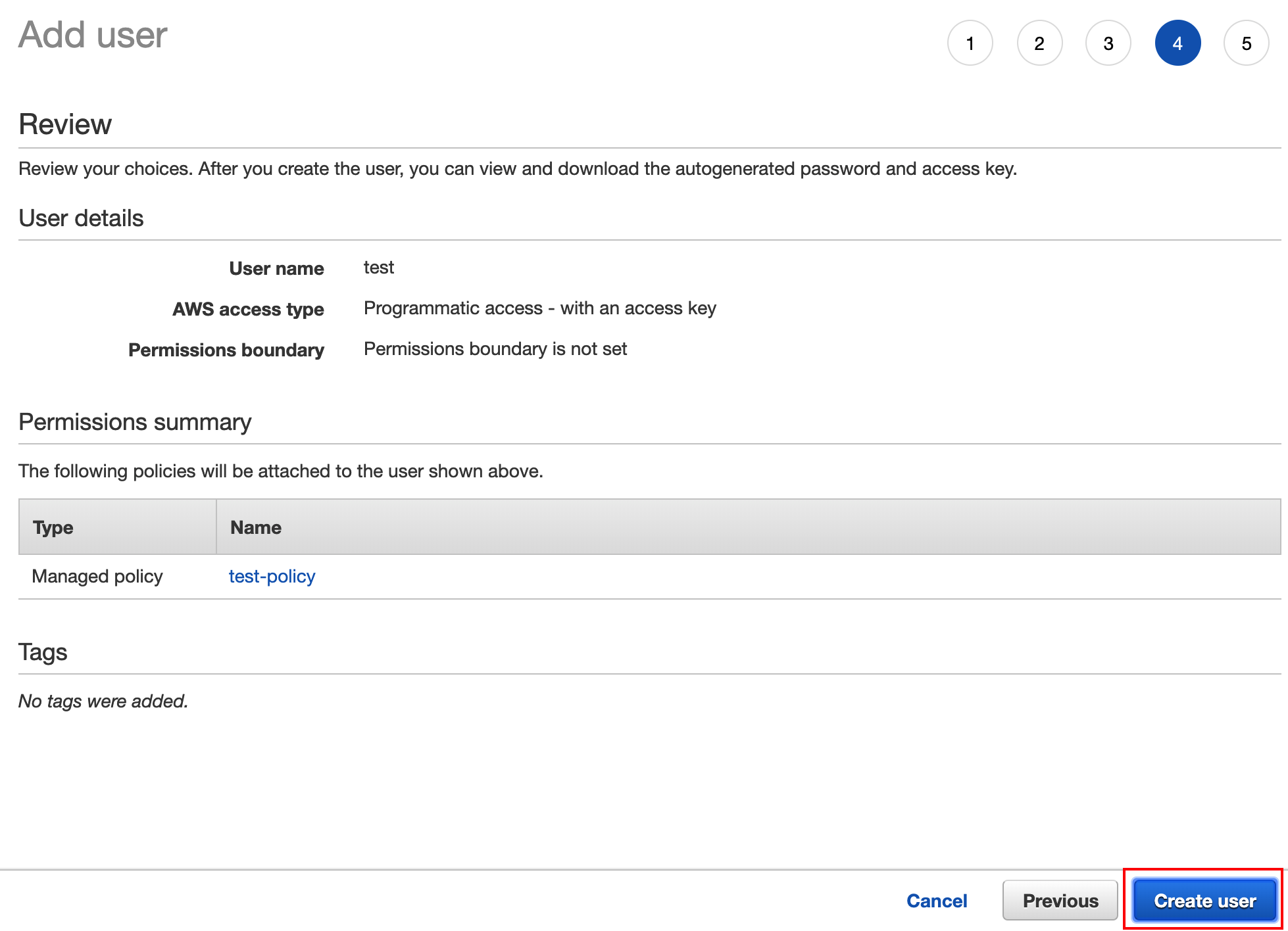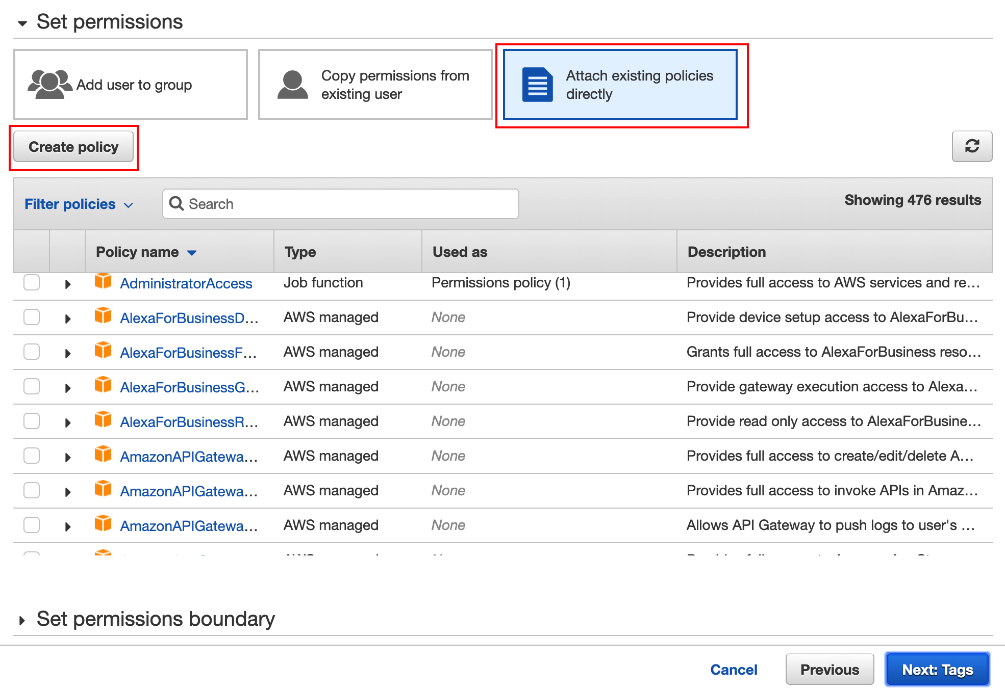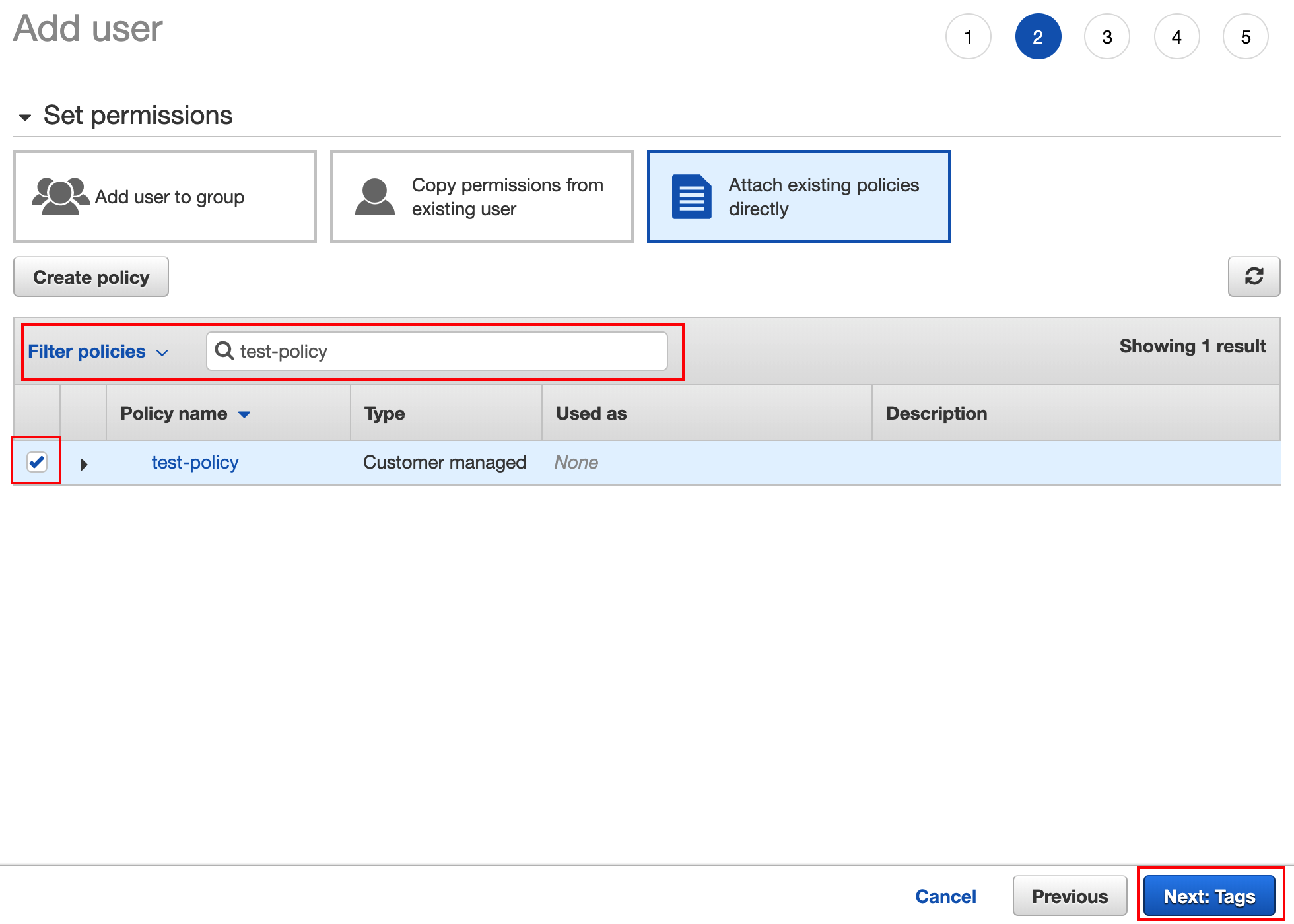 방금 생성한 policy를 검색 > IAM user 생성의 policy 클릭 > "Next: Tags"
