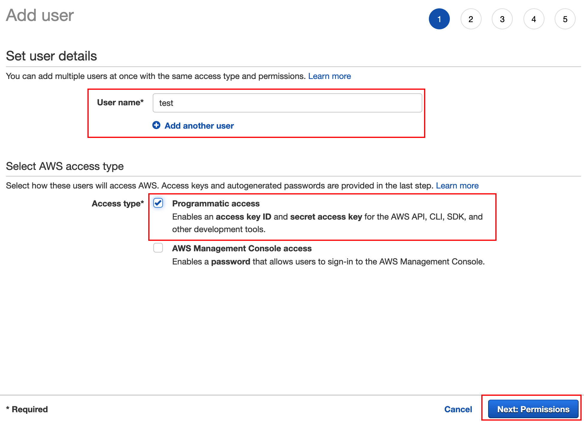 User name 입력 > Access type: Programmatic access 선택 > Next: Permissions 클릭