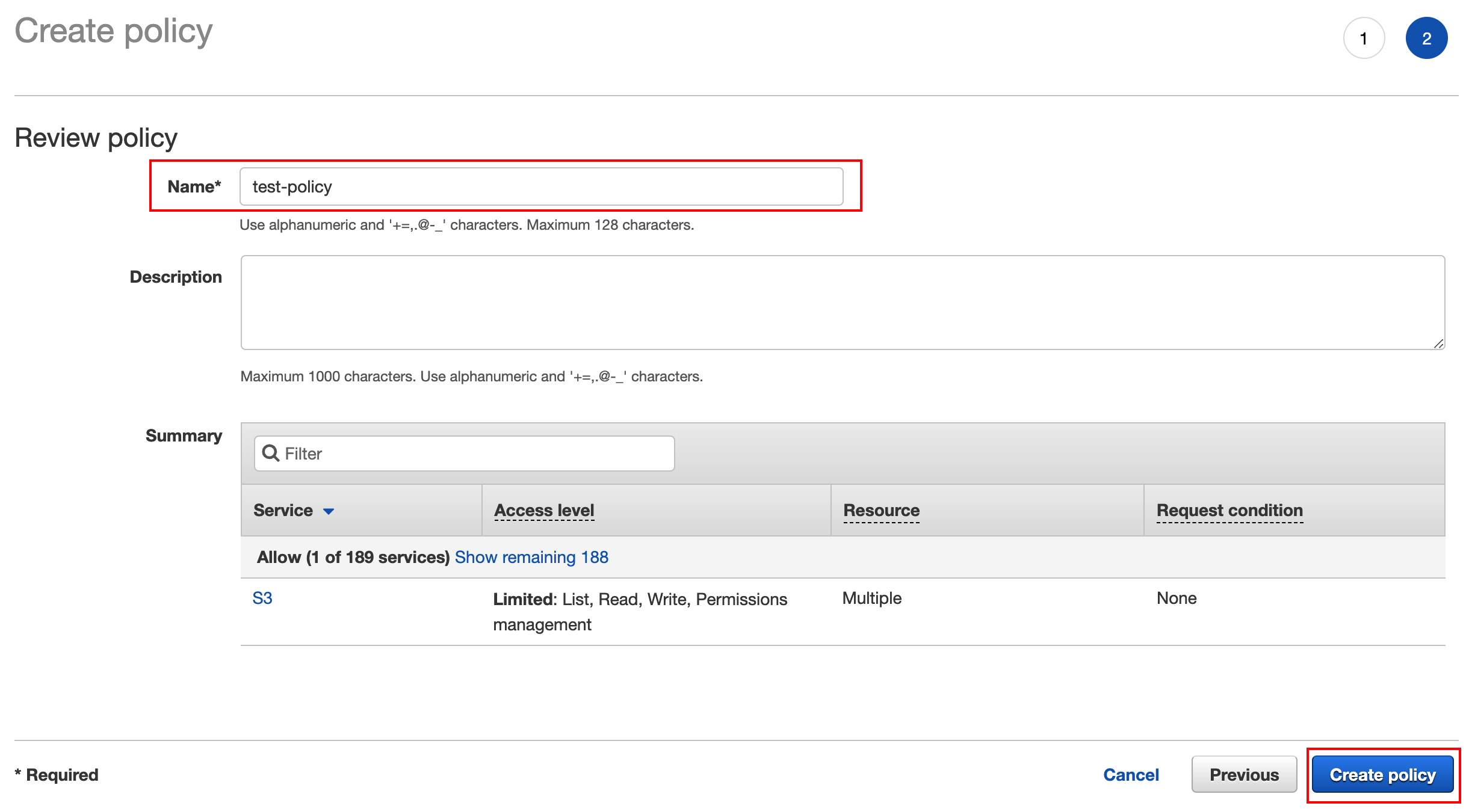 "Attach existing policies directly" 클릭 > "Create policy" 클릭