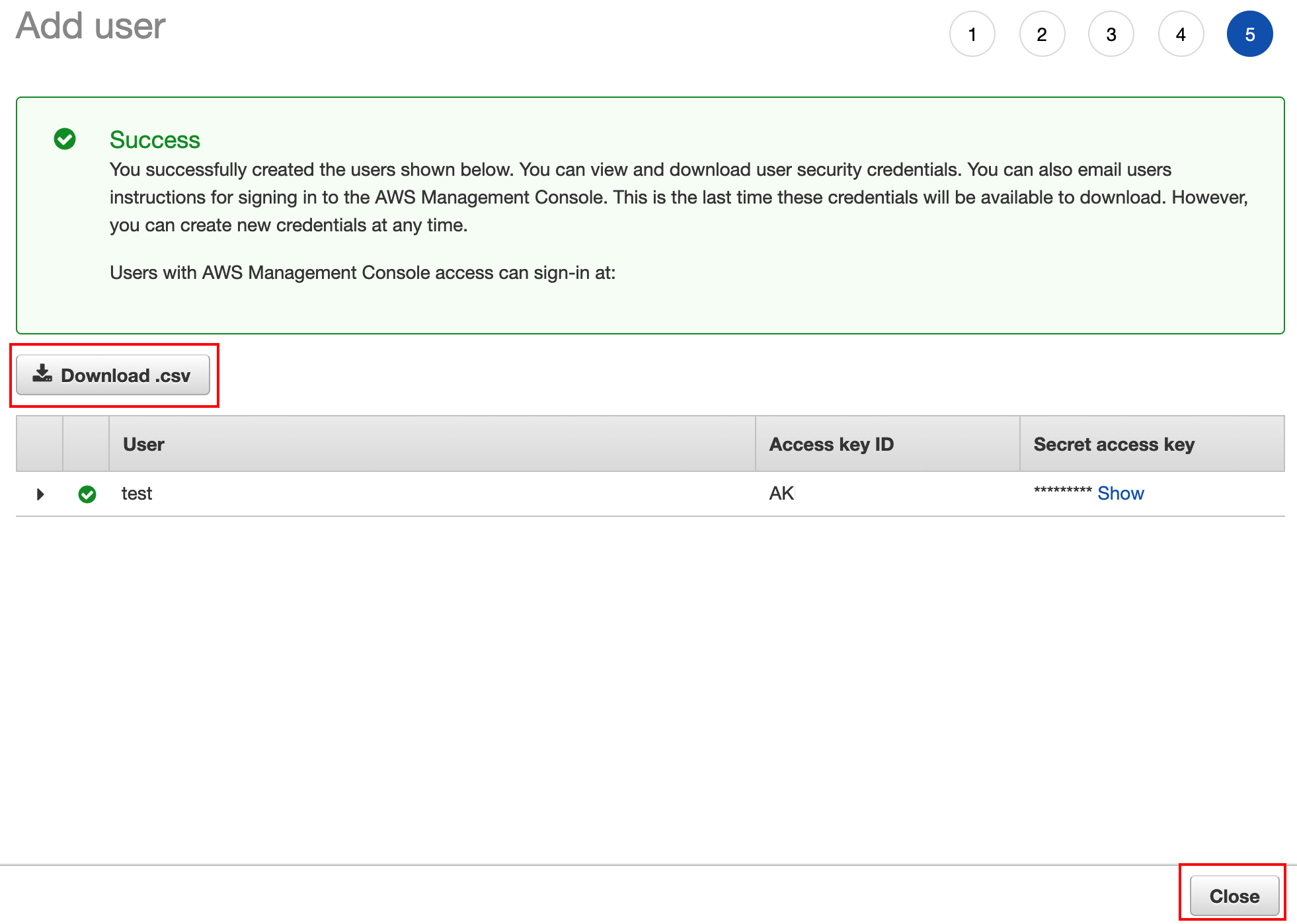 .csv 파일로 된 IAM user의 "Access key ID", "Secret access key"를 다운로드합니다.