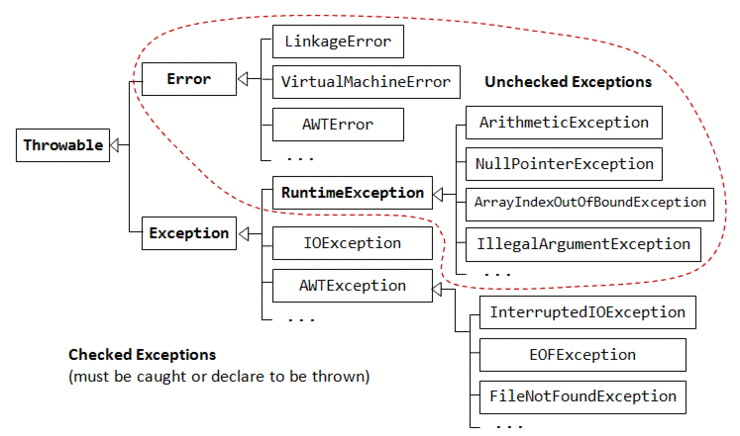 주로 프로그래머의 실수에 의해서 발생될 수 있는 예외들로서 자바의 프로그래밍 요소들과 관계가 깊습니다. 예를 들면, 배열의 범위를 벗어난 경우(IndexOutOfBoundsException), |