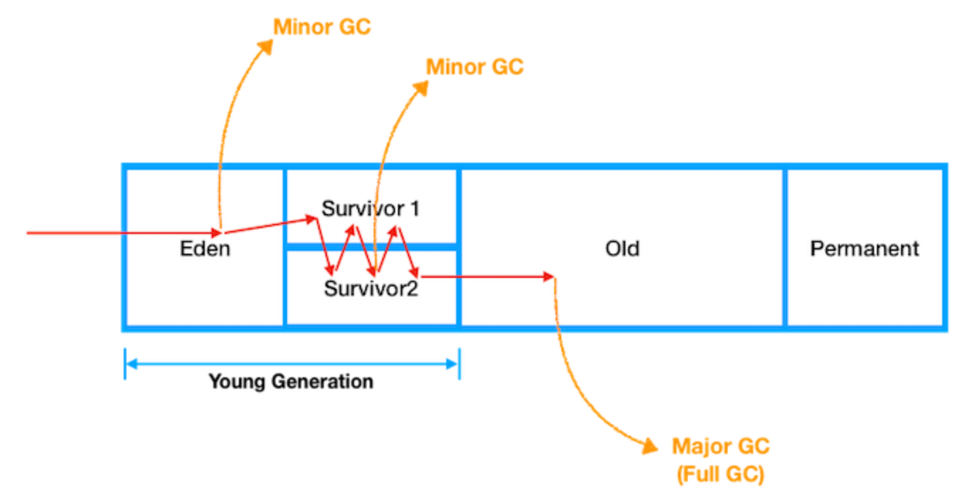 *Objects must exist separately in the Survivor1 or Survivor2 area (When "Minor GC" is executed, one of the Survivor areas must be empty)