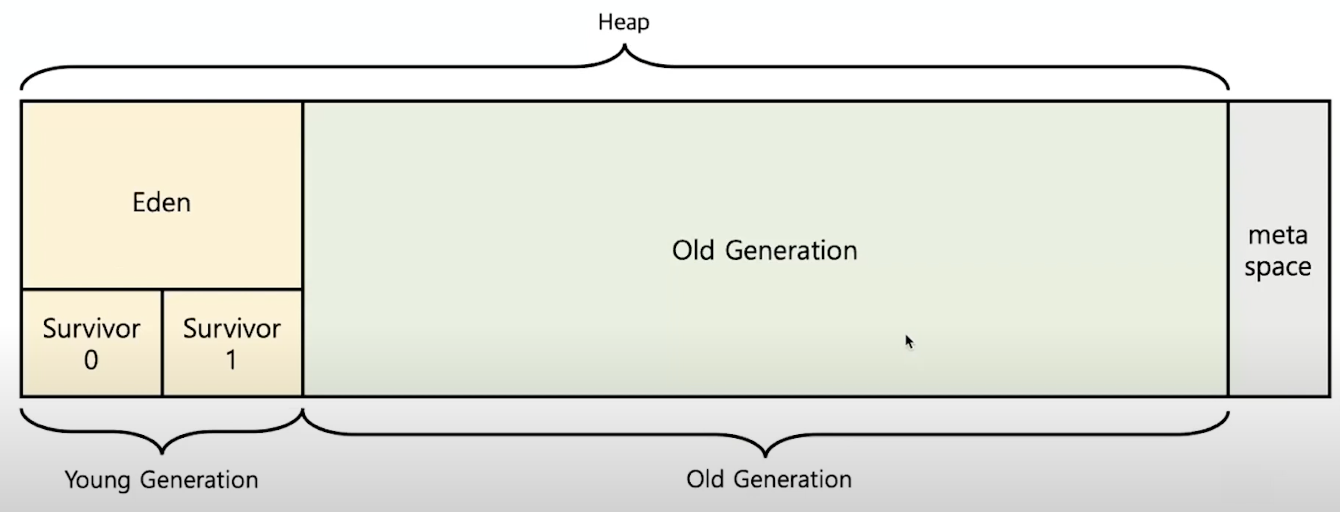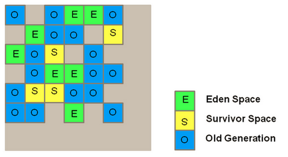 * Young Generation(Eden, Survivor 0, Survivor 1): Newly created objects are located here. Because most objects become quickly inaccessible state, so many objects are created and disappeared only in the Young area. Minor GC occurs when an object disappears in this area.